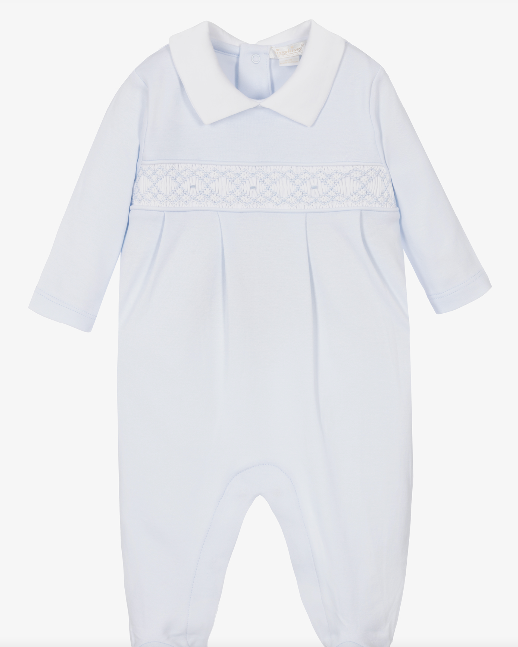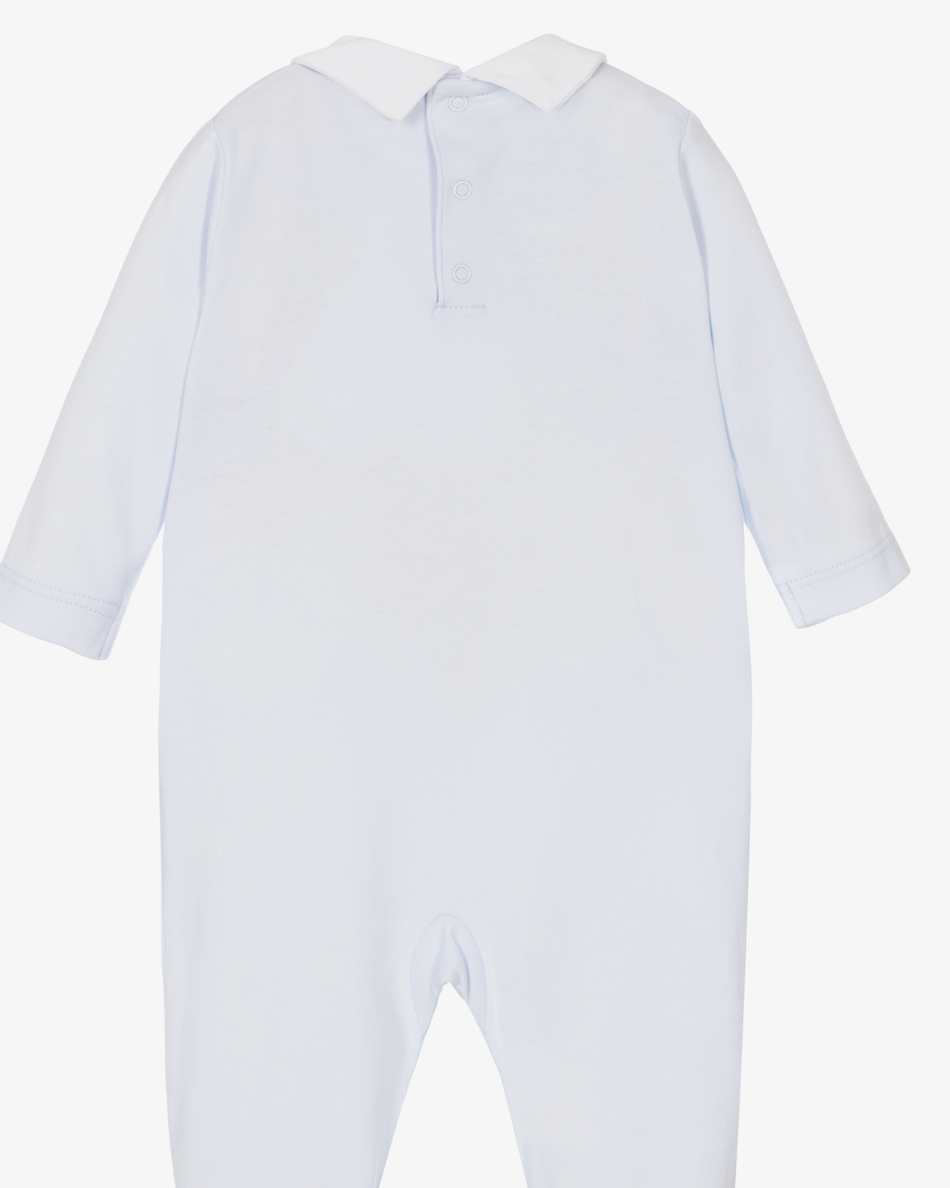 A lovely blue babygrow for boys by Kissy Kissy, made in from the softest Pima cotton jersey. It has a pretty hand-embroidered, smocked chest with a smart white collar, and poppers to fastens at the front and between the legs.
