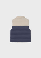 Baby vest with front zip closure. Quilted-effect outer fabric and soft polyester lining for comfort. Filled with 100% recycled polyester. Features a reversible design for two looks in one.