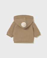 Cardigan for newborn baby boy. Hooded collar. Front zip and toggle fastenings. Knitted fabric, soft and pleasant to the touch. Functional front pockets. Decorative elements: pompom.