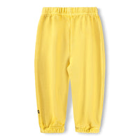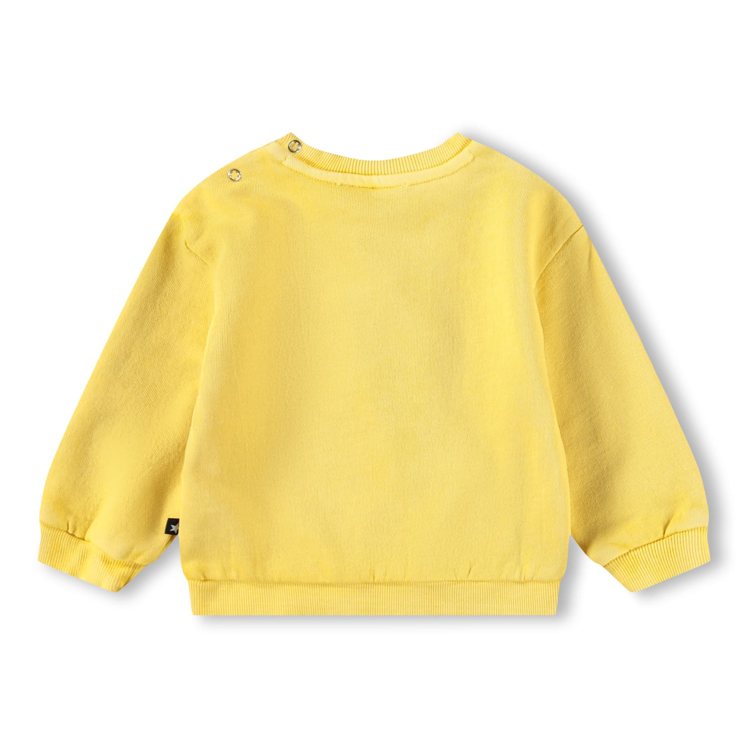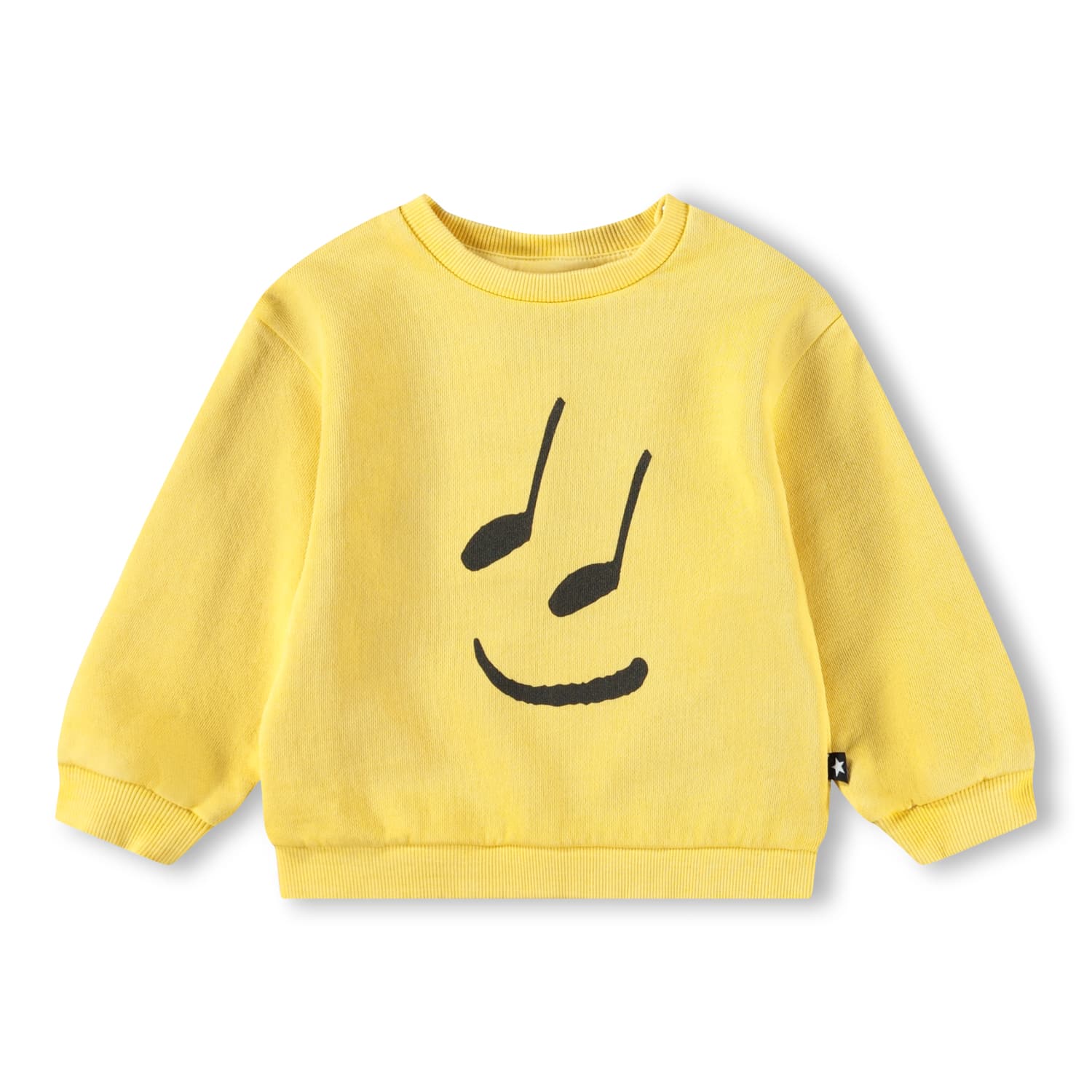 Yellow sweatshirt for small children with a happy notes print. The sweatshirt is in 100% cotton, has a round neck with a rib edge, raglan sleeves with rib and rib at the bottom. The sweatshirt has an easy snap closure at the neck. Wear it with the Simeon organic cotton joggers for the perfect set.