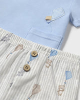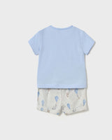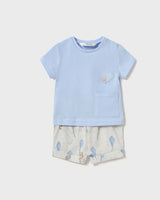 This newborn set pairs a sky-blue printed T-shirt with coordinating shorts, crafted from breathable, gentle fabric to keep baby comfortable.