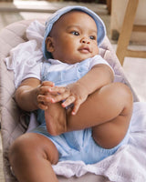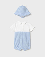 This sky-blue romper mimics the look of dungarees in a cozy one-piece design, paired with a matching hat for a cute, coordinated outfit.