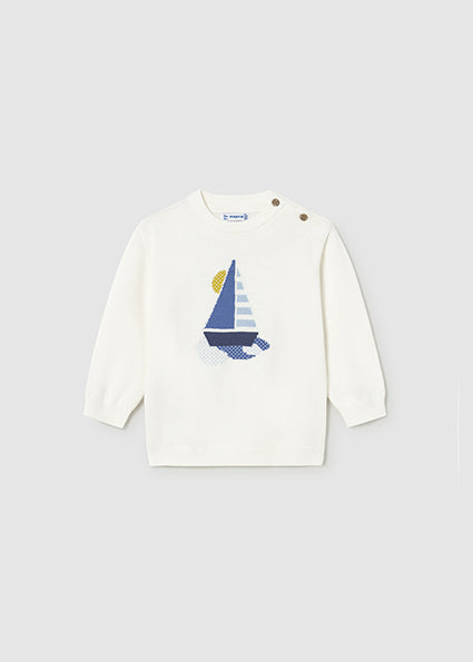 Maritime charm to your little one’s wardrobe with this beautifully crafted knit sweater. Featuring a vibrant nautical sailboat intarsia on the front, this off-white pullover is both stylish and practical.