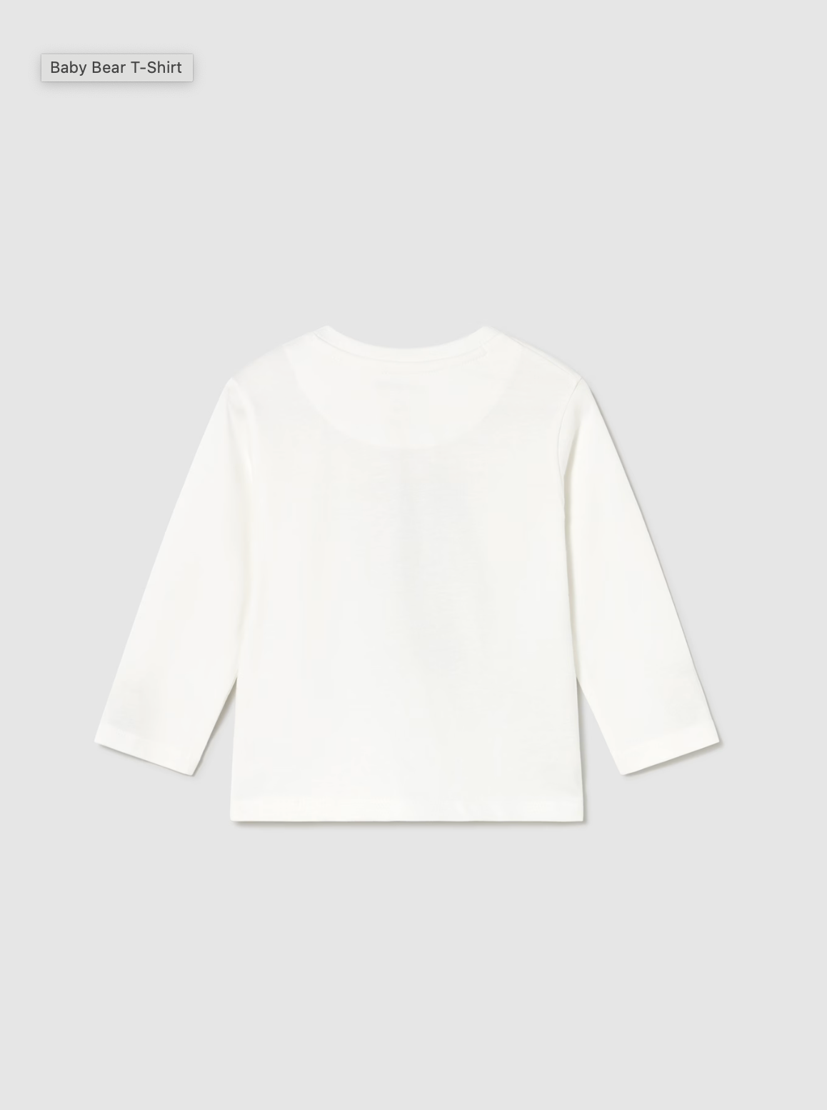 Long sleeved T-shirt for baby. Round neckline. Snap button fastening on the shoulder to allow the garment to be put on easily. Decorative elements: rubber appliques, Print.