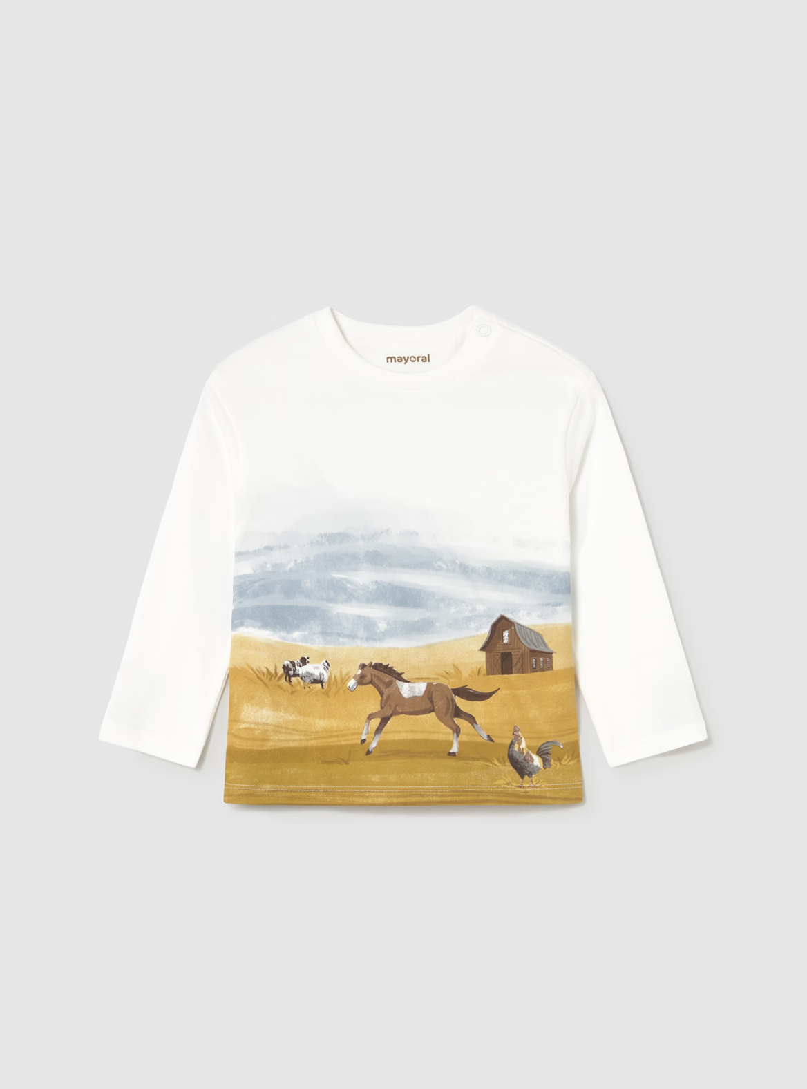 Long sleeved T-shirt for baby. Round neckline. Snap button fastening on the shoulder to allow the garment to be put on easily. 100% cotton. Decorative elements: Print.