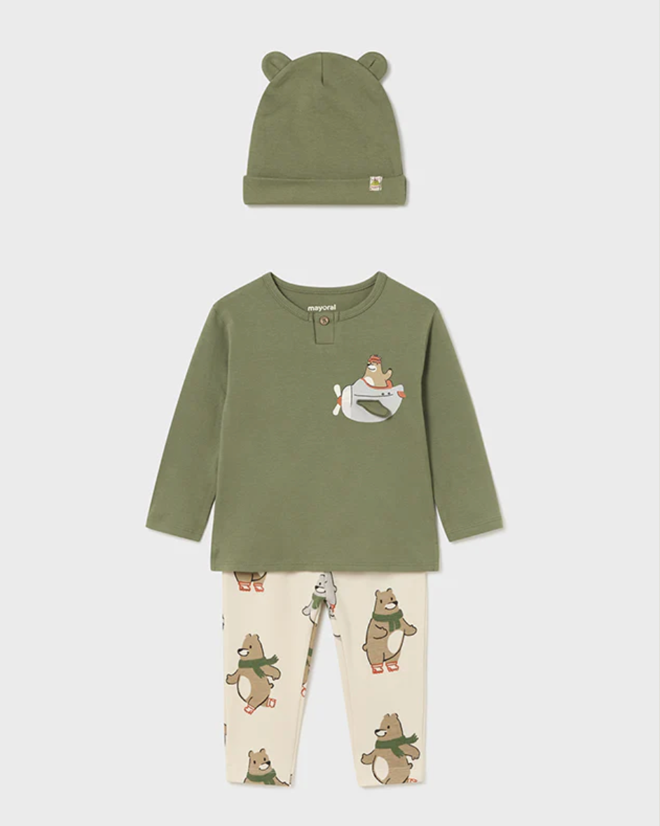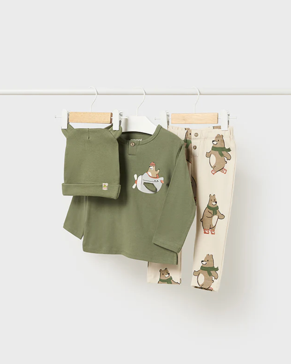 Add some interactive fun to your baby's wardrobe with this 3 piece set! Featuring a playful motif, this set includes a onesie, pants, and cap