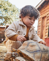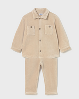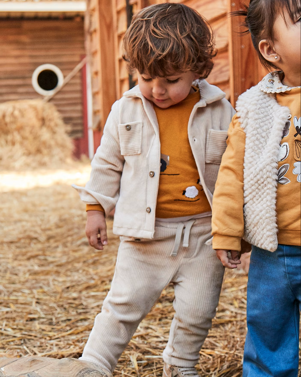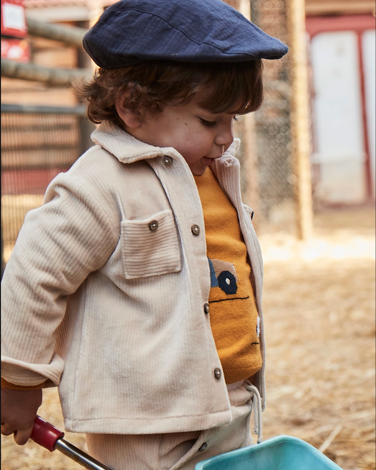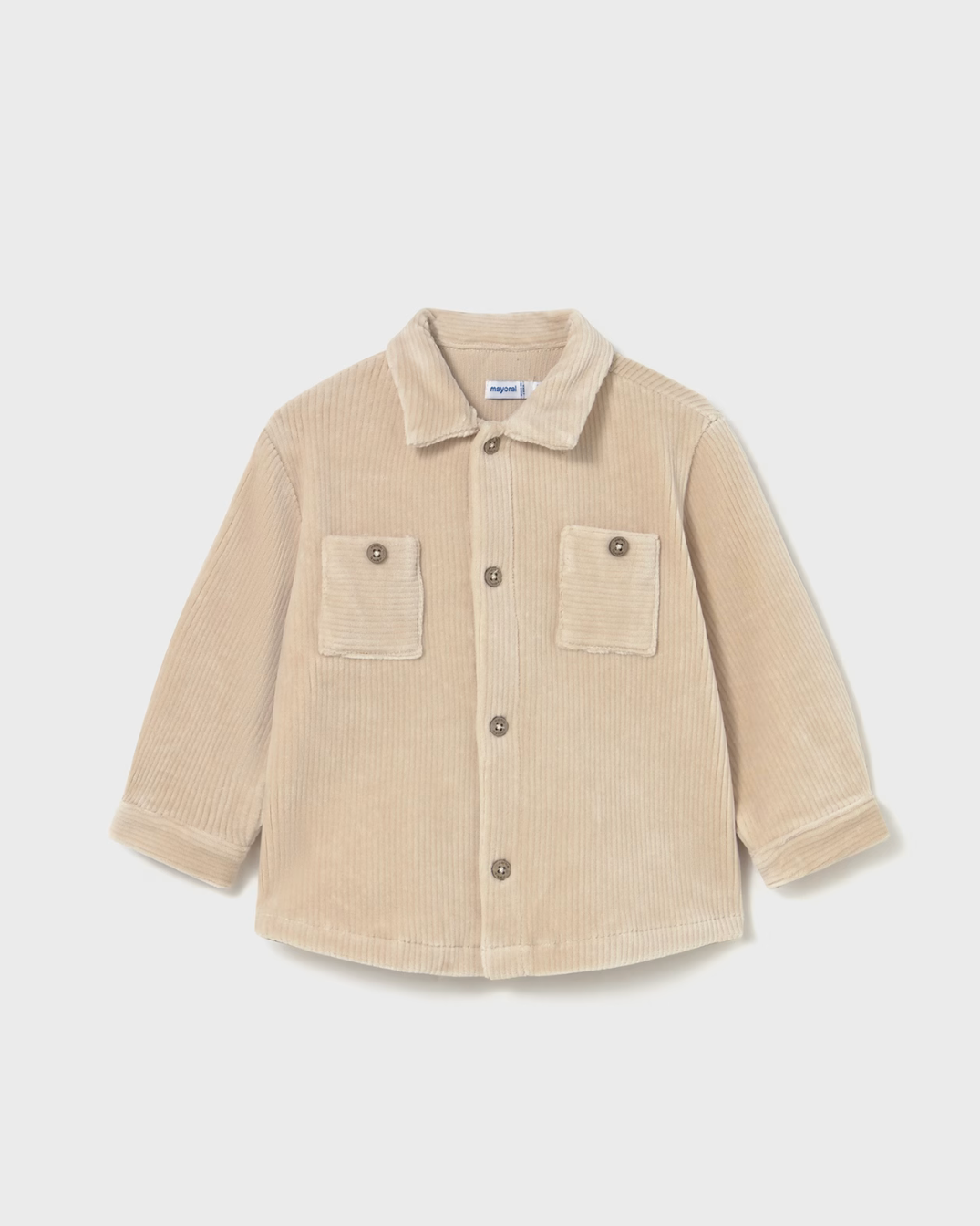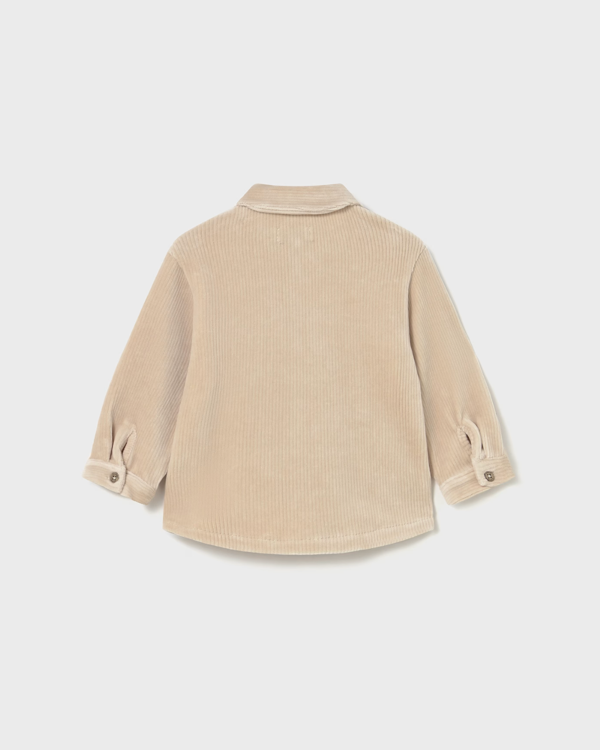 Long sleeved Overshirt for baby. Shirt collar. Button fastenings down the front. Made using comfortable and soft corduroy fabric. Functional front pockets.