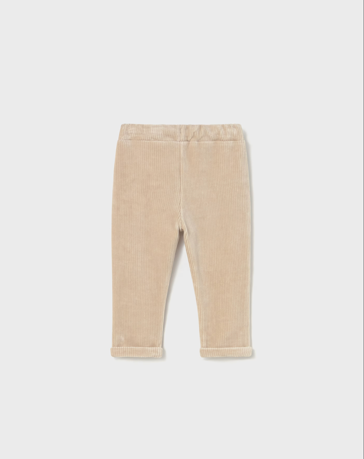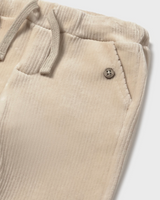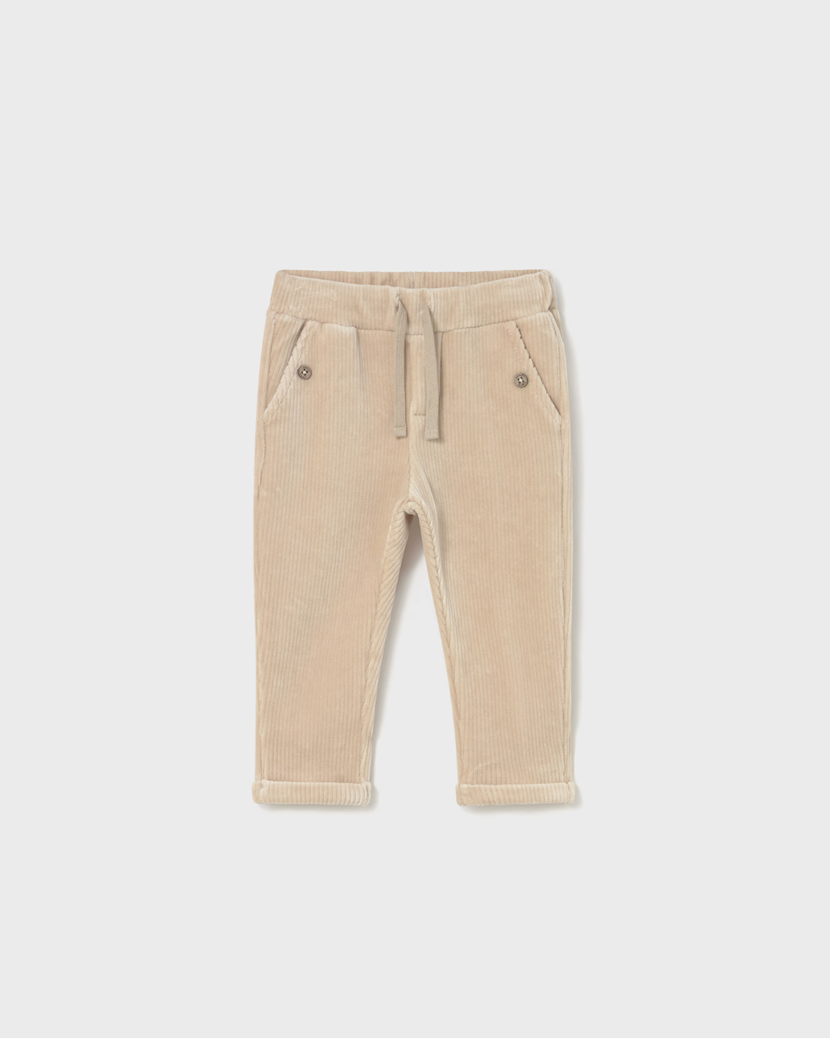 Chino style relaxed fit pants for baby boy. Elasticated waistband with adjustable drawstring. Made using comfortable and soft corduroy fabric. Front pockets. Decorative elements: decorative buttons.