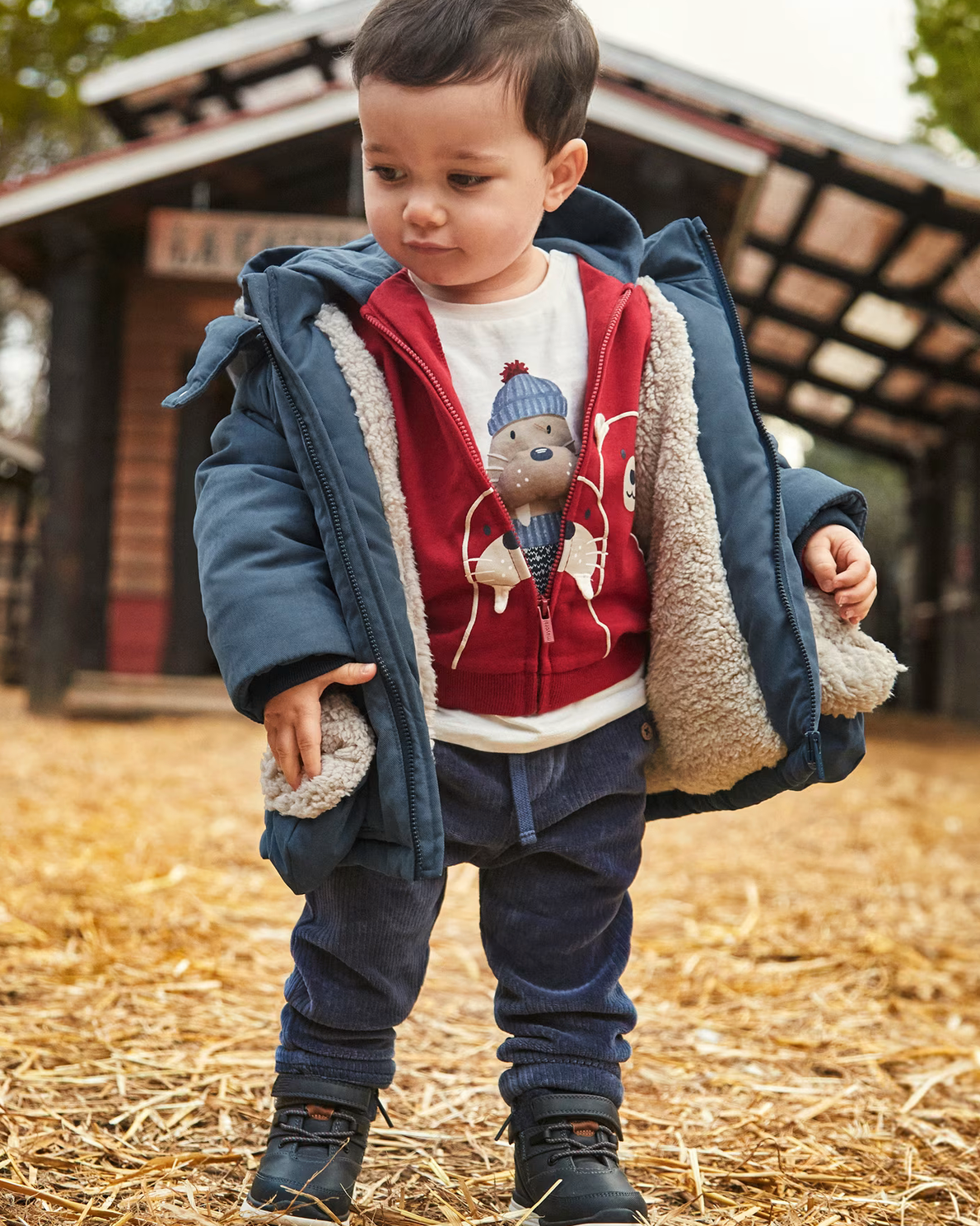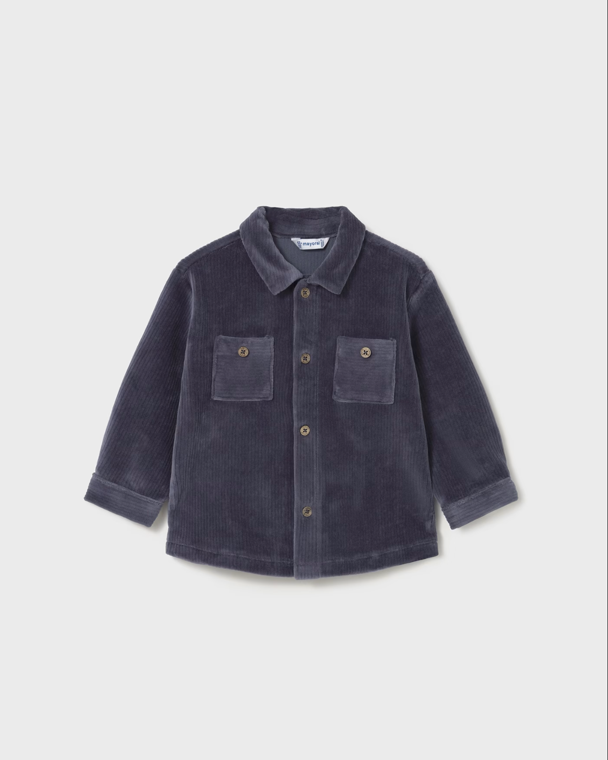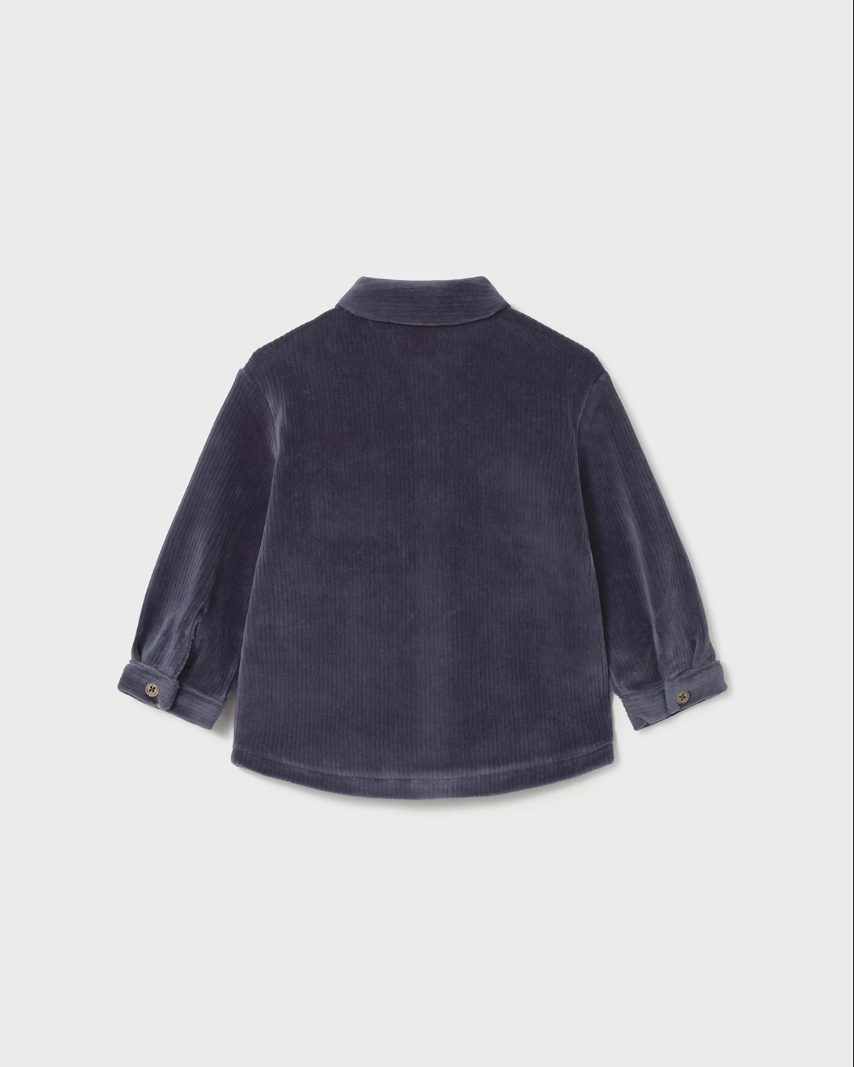 Long sleeved Overshirt for baby. Shirt collar. Button fastenings down the front. Made using comfortable and soft corduroy fabric. Functional front pockets.