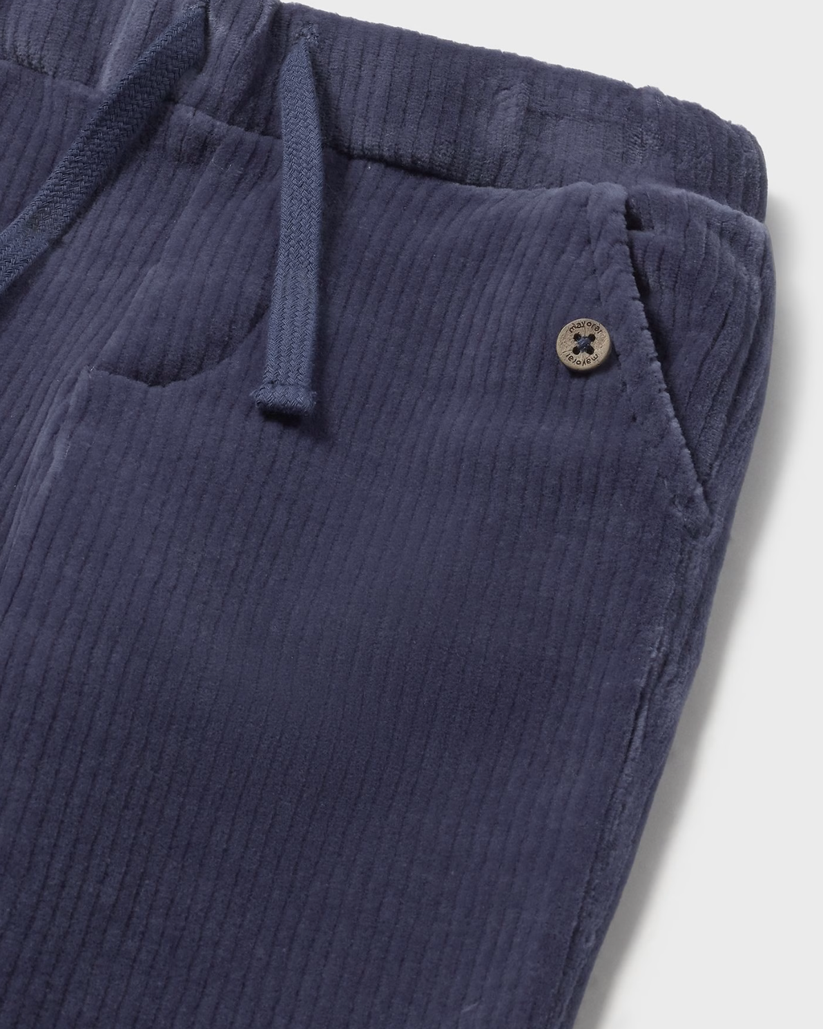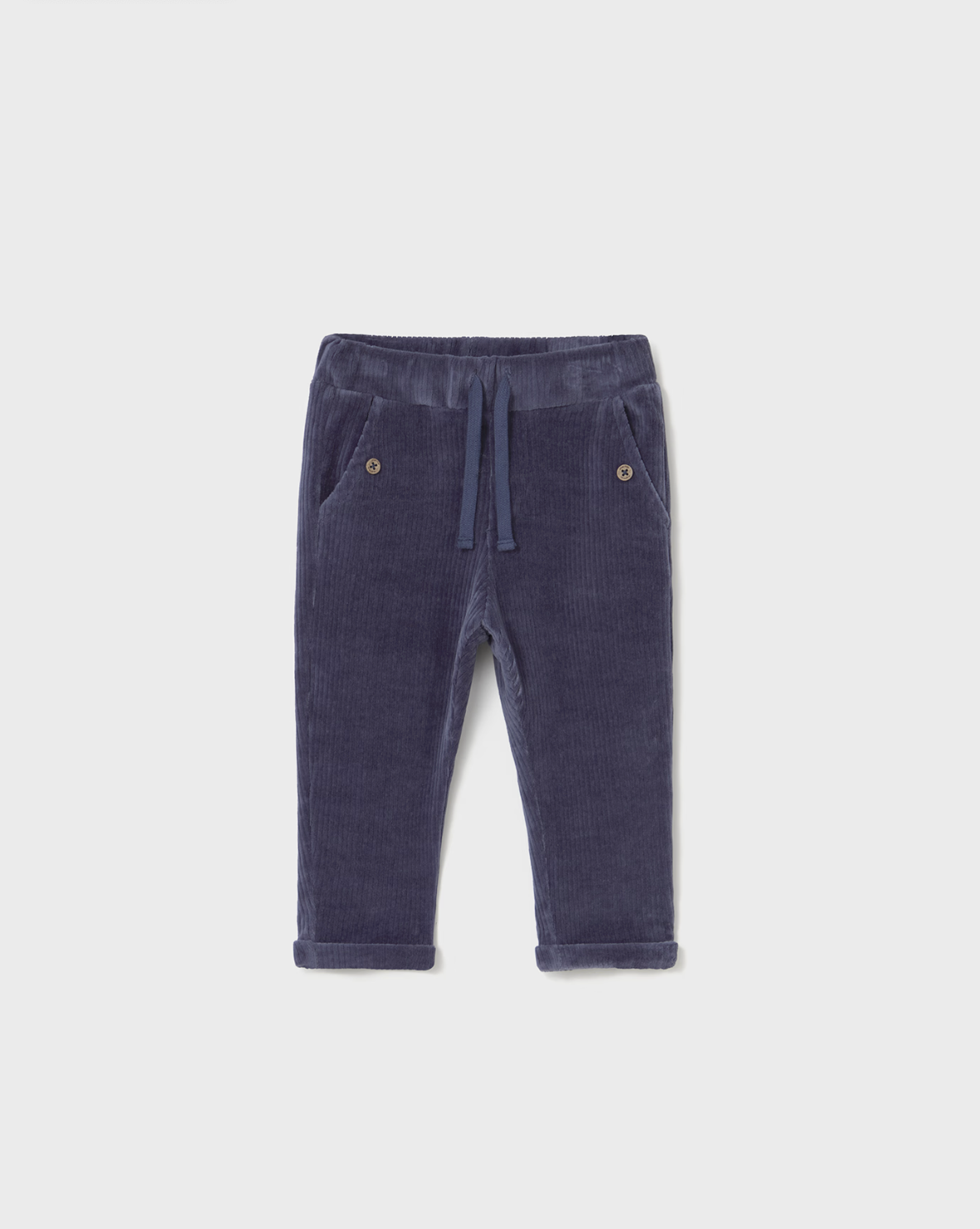 Chino style relaxed fit pants for baby boy. Elasticated waistband with adjustable drawstring. Made using comfortable and soft corduroy fabric. Front pockets. Decorative elements: decorative buttons.