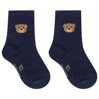 Three pack socks for boys by Mayoral. Made from comfortable cotton, this set includes navy blue and ivory socks, each featuring a brand logo and a playful teddy bear print.