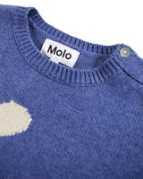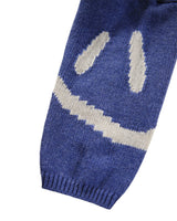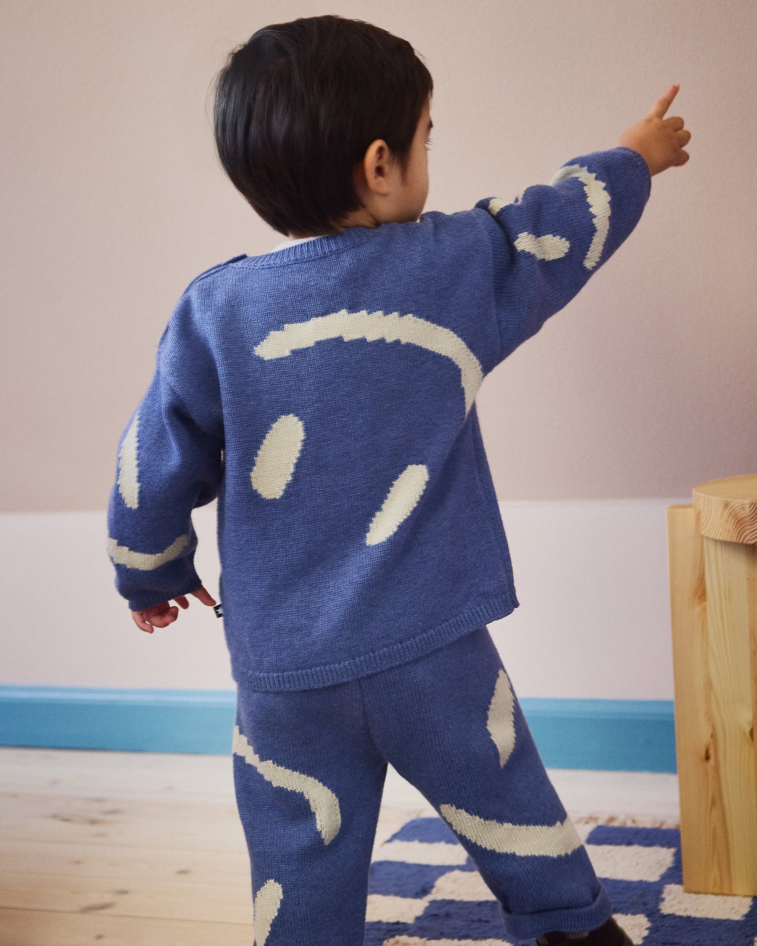 Blue knitted sweater for the little ones made of a soft cotton and wool blend with white smiling faces. The sweater has a loose fit and button closure at the shoulder to make it easier to put on. Knitted blue pants for the little ones made of a wool and cotton blend. White smiling faces are woven into the pants legs. The pants have a loose fit with wide cuffs and an elastic waist.