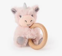 Everyone's favorite plush characters are now pint-sized wooden ring rattles! Oh-so-adorable, these tiny friends are the perfect complement to any character-themed baby gift set. Crafted of soft plush, mixed with a natural wood ring these baby sensory toys are sure to be a favorite in the nursery toy lineup