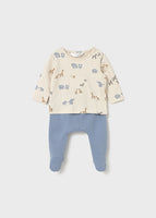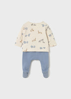 Long sleeved Sweatshirt for newborn baby boy. Crossover collar and full side slit with press stud fastenings. Made from soft elasticated cotton fabric. Functional front pocket. Patterned design.