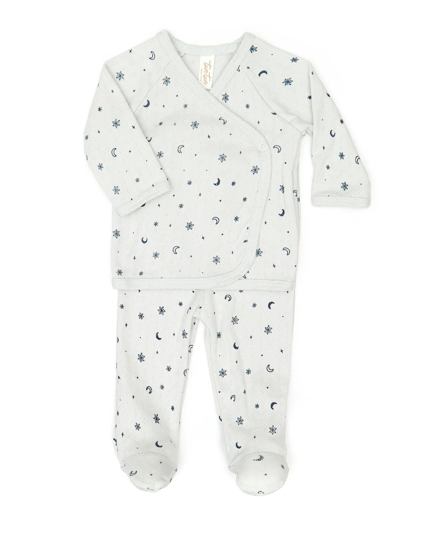 Wrap your little snowflake in cozy charm with the Pointelle Kimono Set in Light Blue Snowflakes. This soft, breathable set makes dressing easy and comfy, perfect for welcoming tiny adventures and sweet snuggles alike. Designed for gentle skin and cheerful days, it’s a playful outfit to brighten every baby’s wardrobe.