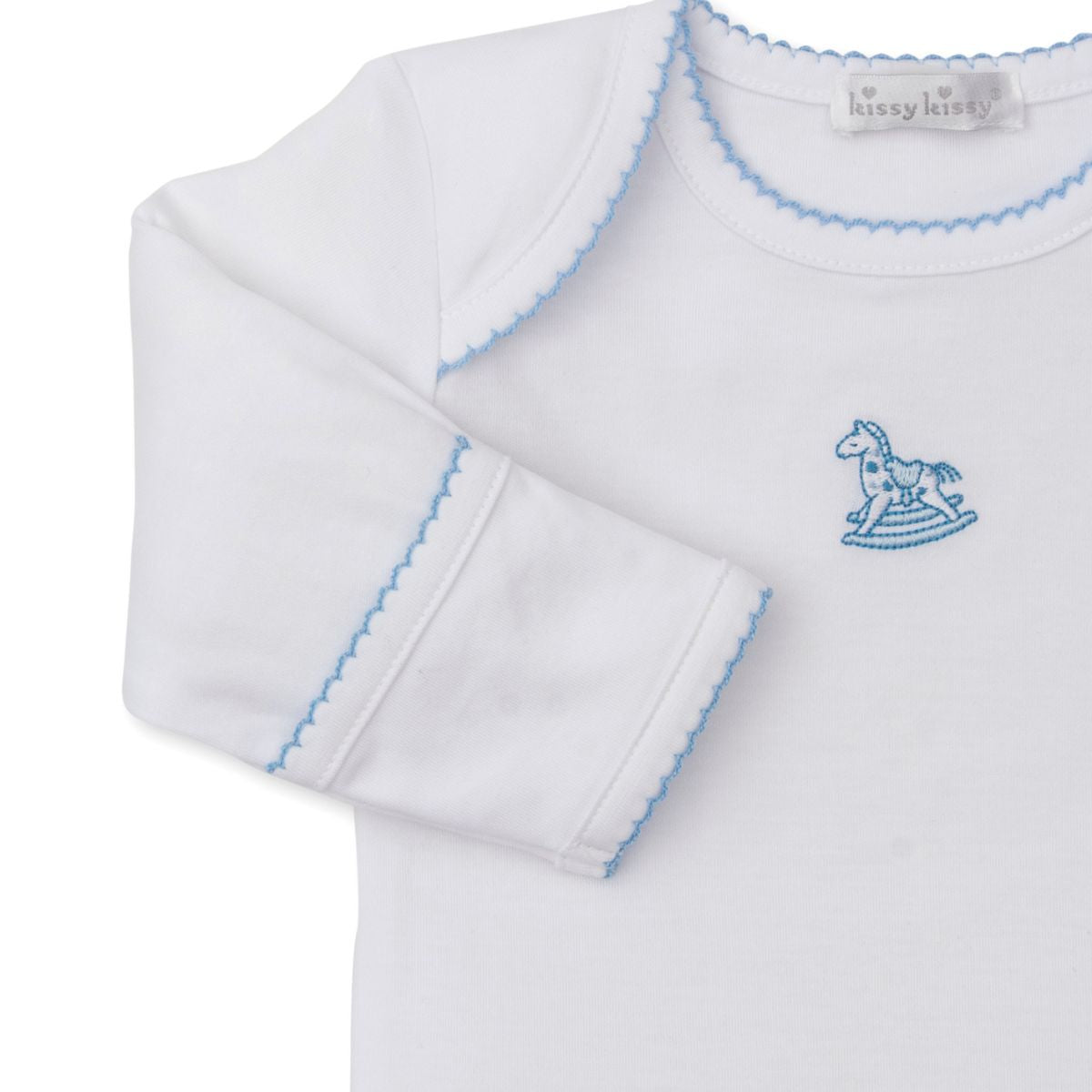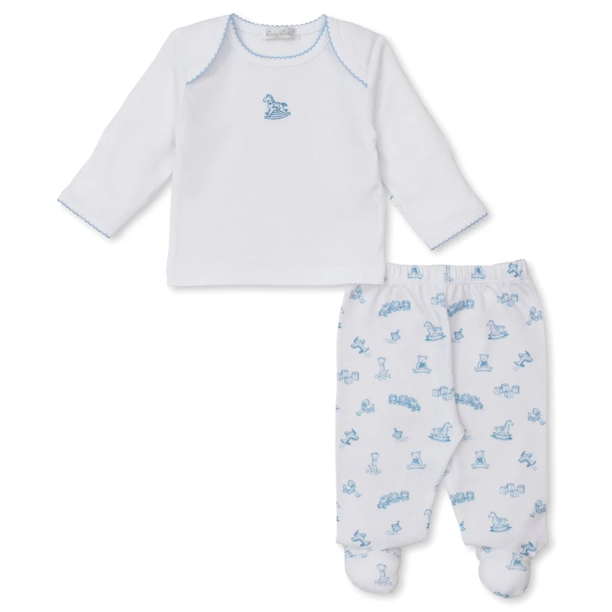 This charming two-piece outfit makes getting baby dressed a breeze. The set includes a sweet, vintage toy themed tee, featuring a beautifully embroidered rocking horse. It’s paired with matching vintage toy treasures print pants, adorned with delightful blue illustrations of classic toys.
