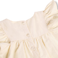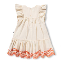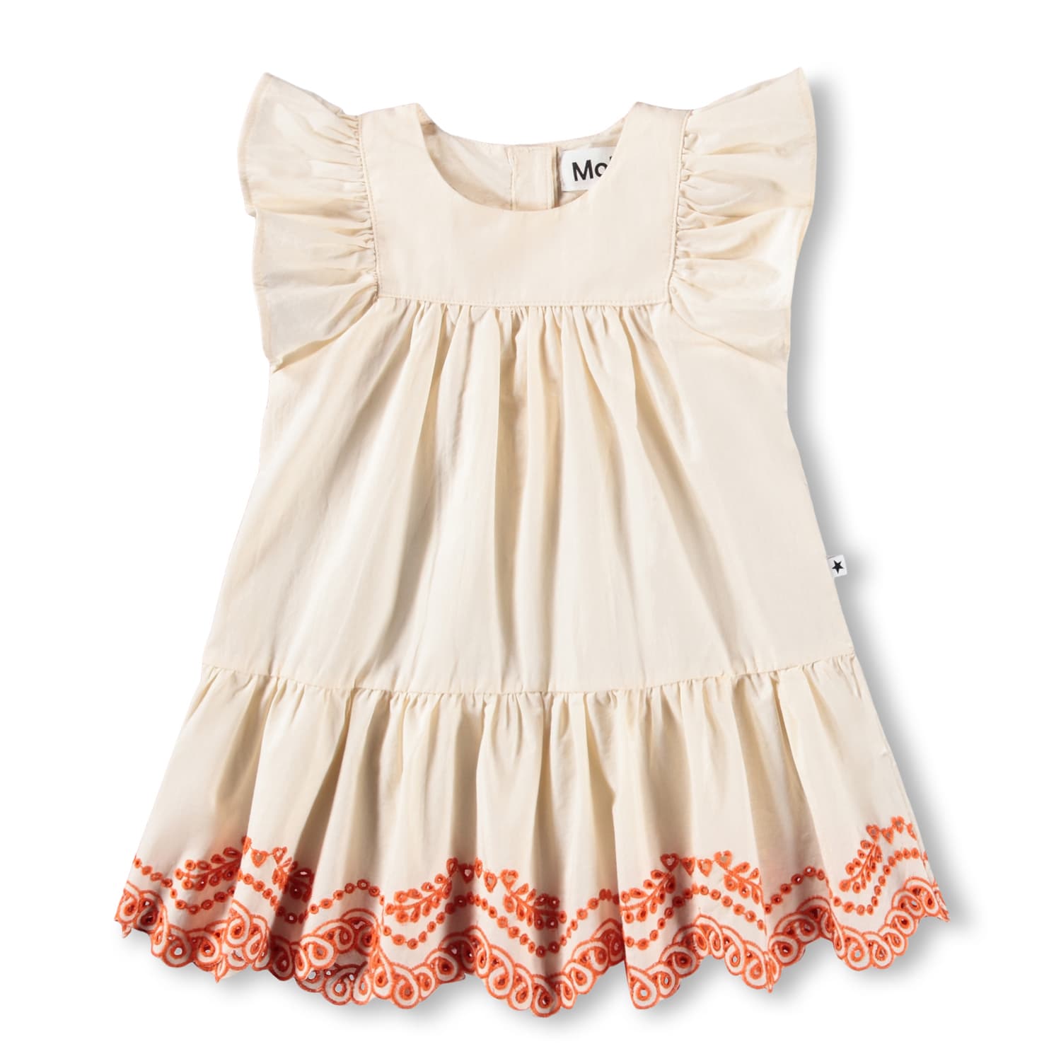 Pearled ivory dress for the little ones in organic cotton with delicate orange details. The dress features lovely ruffle sleeves, a skirt with broderie anglaise decoration at the bottom of the dress, and a button closure at the back, making it easy to put on and take off.