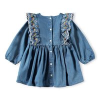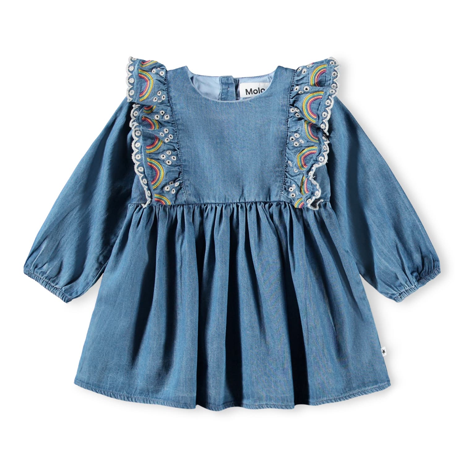Long-sleeved, blue dress for the little ones made of organic cotton chambray. The dress has ruffles with embroidery details in white and rainbow colours, button closure at the back, and a slight volume in the sleeves and skirt. It is a comfortable fit and easy to put on and take off.This Molo product is GOTS Organic certified by Ecocert Greenlife, License no. 197496.
