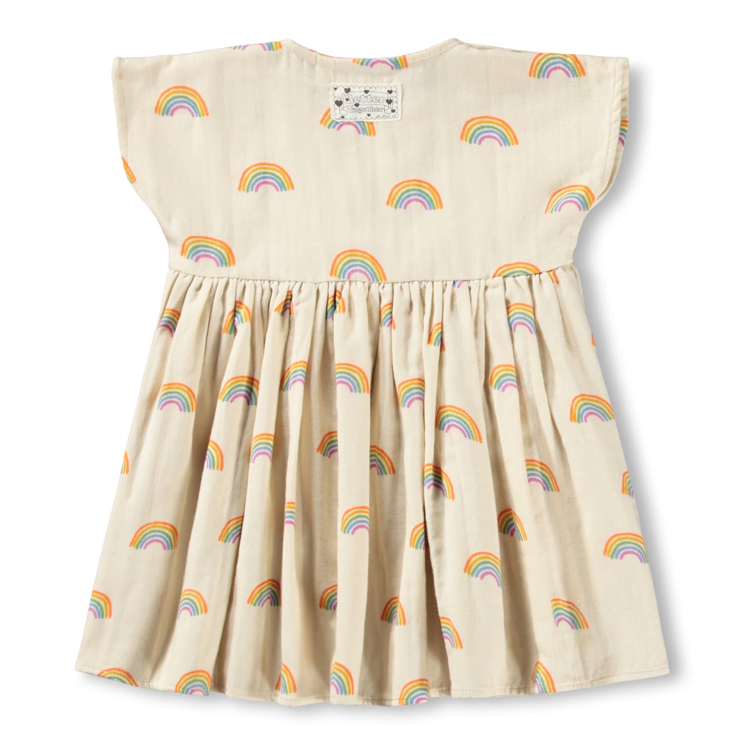 Cream-coloured dress for the little ones made of organic cotton with a rainbow print. It is designed with a round neck, short sleeves, high waist, a skirt with fine volume, and snap buttons at the back for easy dressing.
