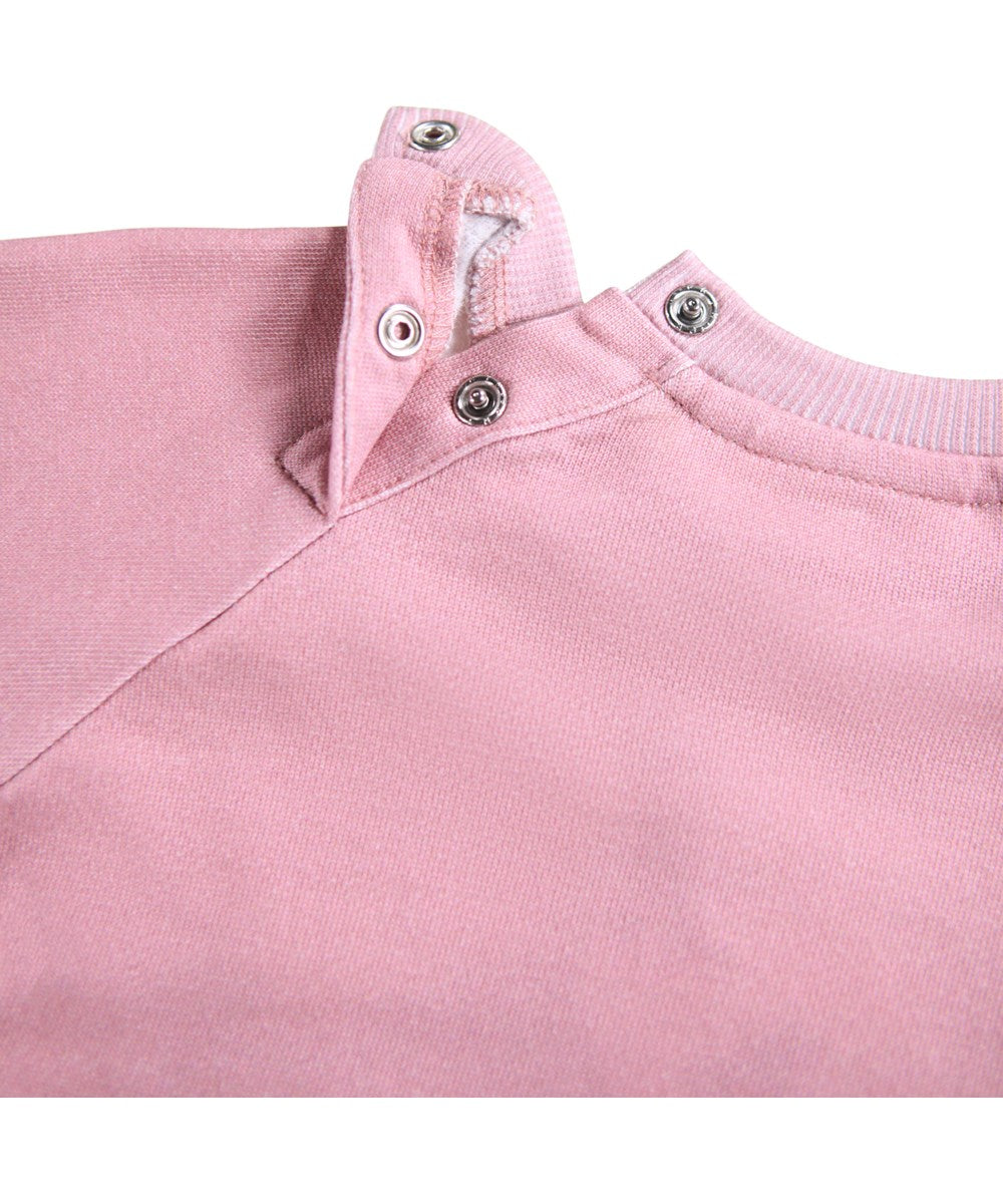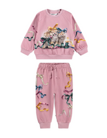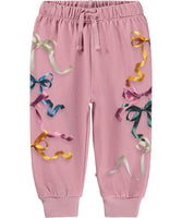 Soft pink set for the little ones made of organic cotton. It is in dark pink with a print of animals with bows on. The sweatshirt has raglan sleeves, ribbed edges and a round neckline with button closure behind the shoulder to make it easy to take off and put on. Soft pants for the little ones made of organic cotton. The pants are dark pink with a print of colorful ribbons and bows. The pants have elastic and drawstrings around the waist and ribbed cuffs around the legs. They are easy to take off and put on and provide plenty of freedom to move.