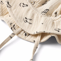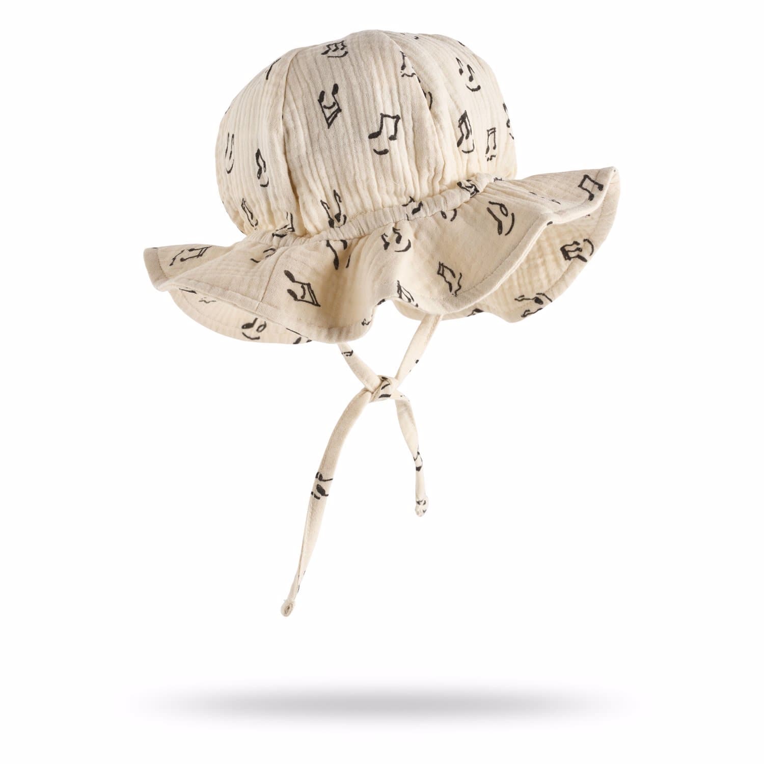Noel is a beige baby hat with a brim and ties. It is constructed in 100% cotton mousseline and is in an all over print of happy notes drawings.