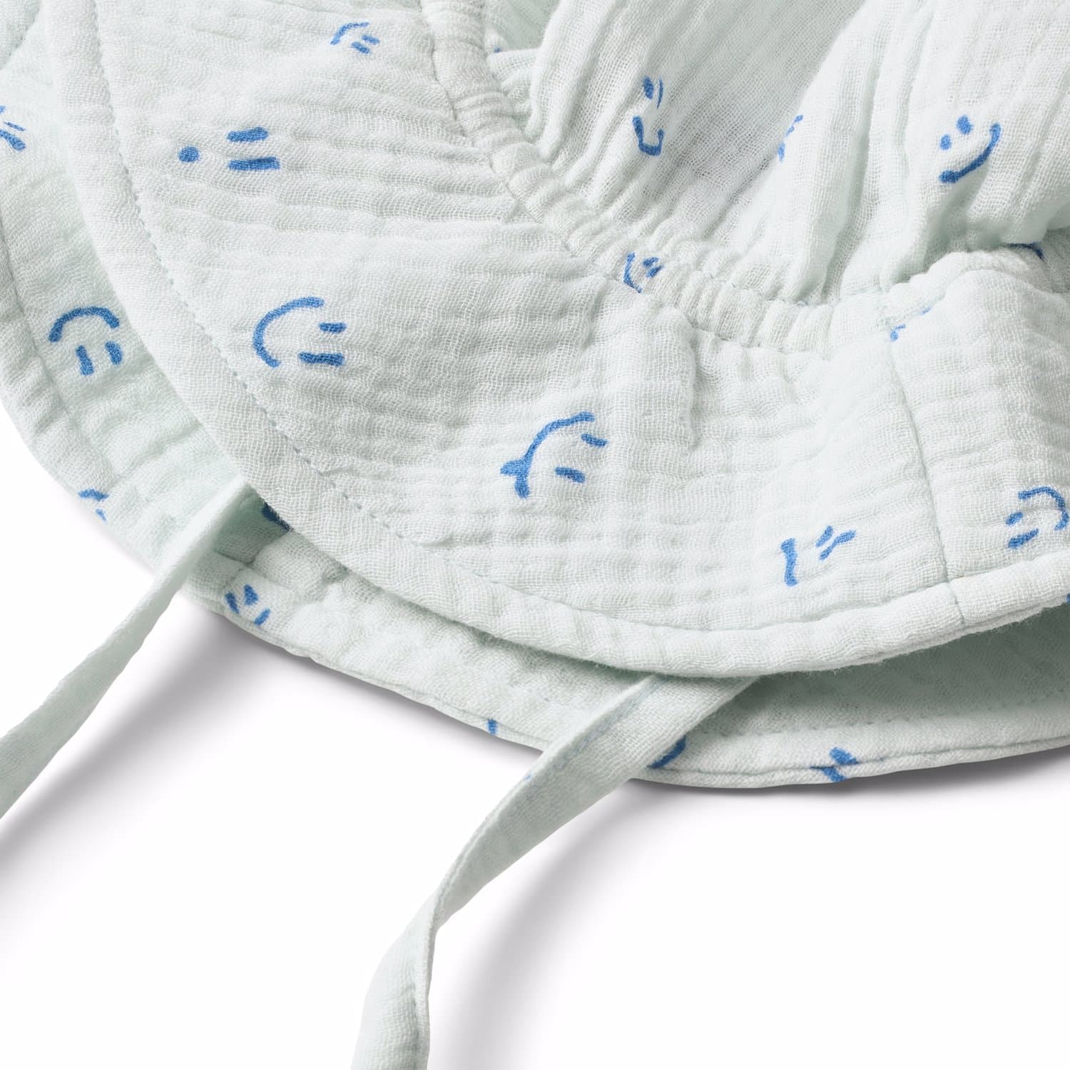 Light blue sun hat for the little ones made of soft, organic cotton muslin with a happy print. It is light and airy with a brim and ties to keep it in place.
