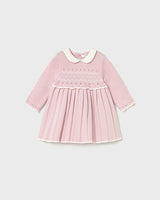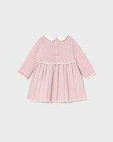 Long sleeved Dress for newborn baby girl. Baby neck. Button fastenings down the back to allow the garment to be put on and taken off easily. Knitted fabric, soft and pleasant to the touch. Pleated design. Jacquard stitch designs.