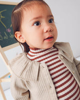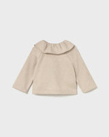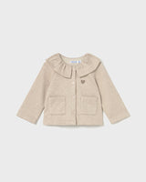 Long sleeved Jacket for baby. Round neckline with ruffles. Button fastenings down the front. Combination of different fabrics to achieve a unique and special design. Functional front pockets. Decorative elements: embroidery.