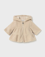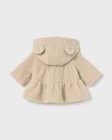 Long sleeved Hoodie for newborn baby girl. Hooded collar. Front, central zip fastening. Soft and smooth outer faux fur fabric. Decorative elements: appliqued ears motifs.