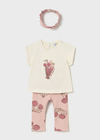 Dress your little sweetheart in this charming 3-piece coordinated outfit. Featuring a soft cream t-shirt with a vintage-inspired cherry sundae graphic, paired with high-stretch ribbed leggings in a playful cherry print. The matching ruffled headband completes this head-to-toe look.