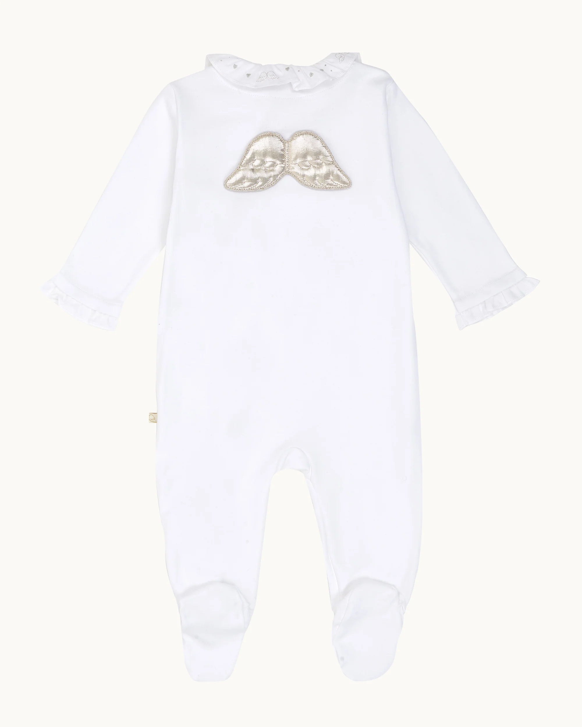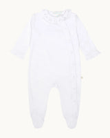 Made from the softest Pima Cotton, Marie-Chantal's best-selling Angel Wing Sleepsuit in White features the signature Angel Wing design in Silver and an embroidered ruffle collar.