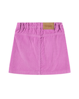 Purple corduroy skirt with buttons for fastening. The skirt reaches mid-thigh and has a waist with belt loops and front pockets. The beautiful cut includes detailed stitching that runs from the pockets down.