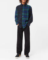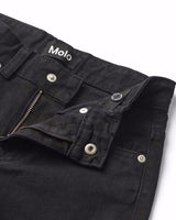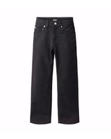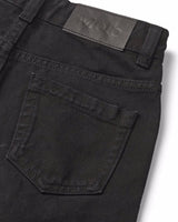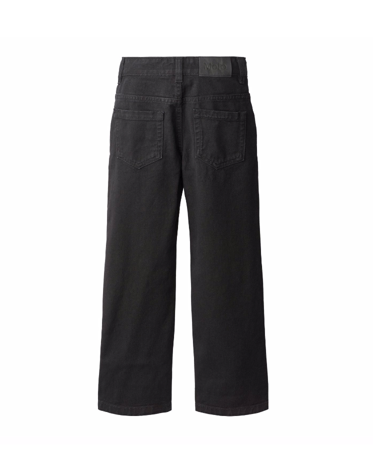 Black organic cotton jeans with straight legs, side pockets, back pockets, and a regular fit.