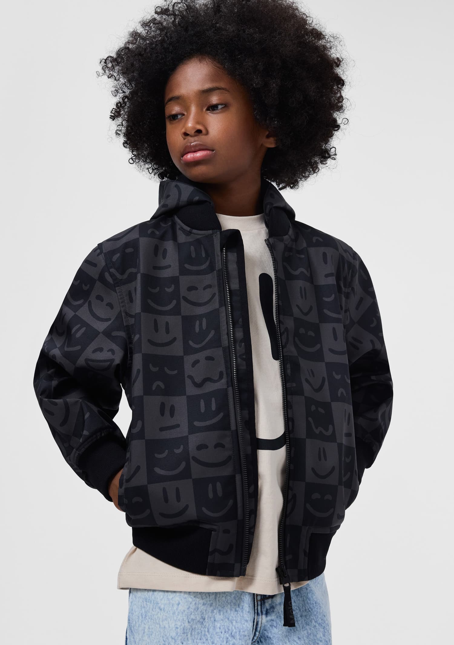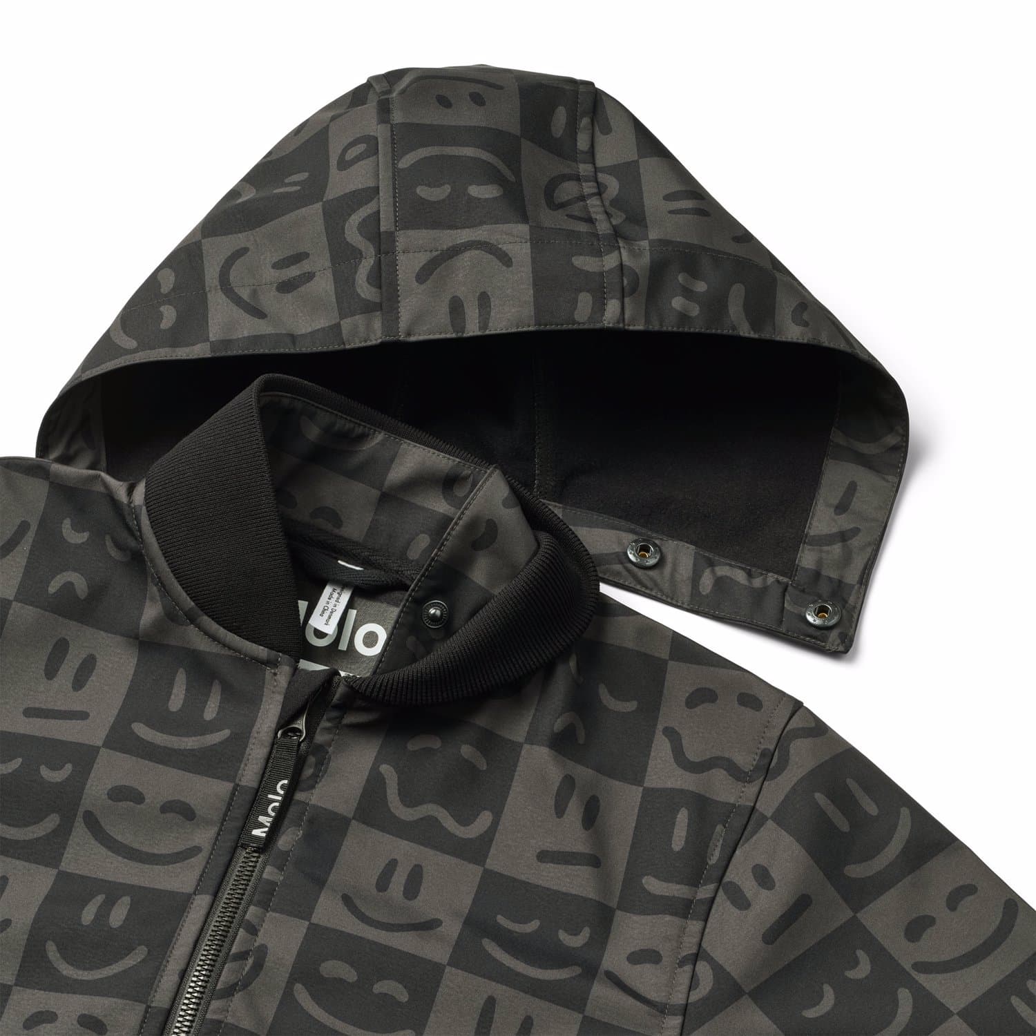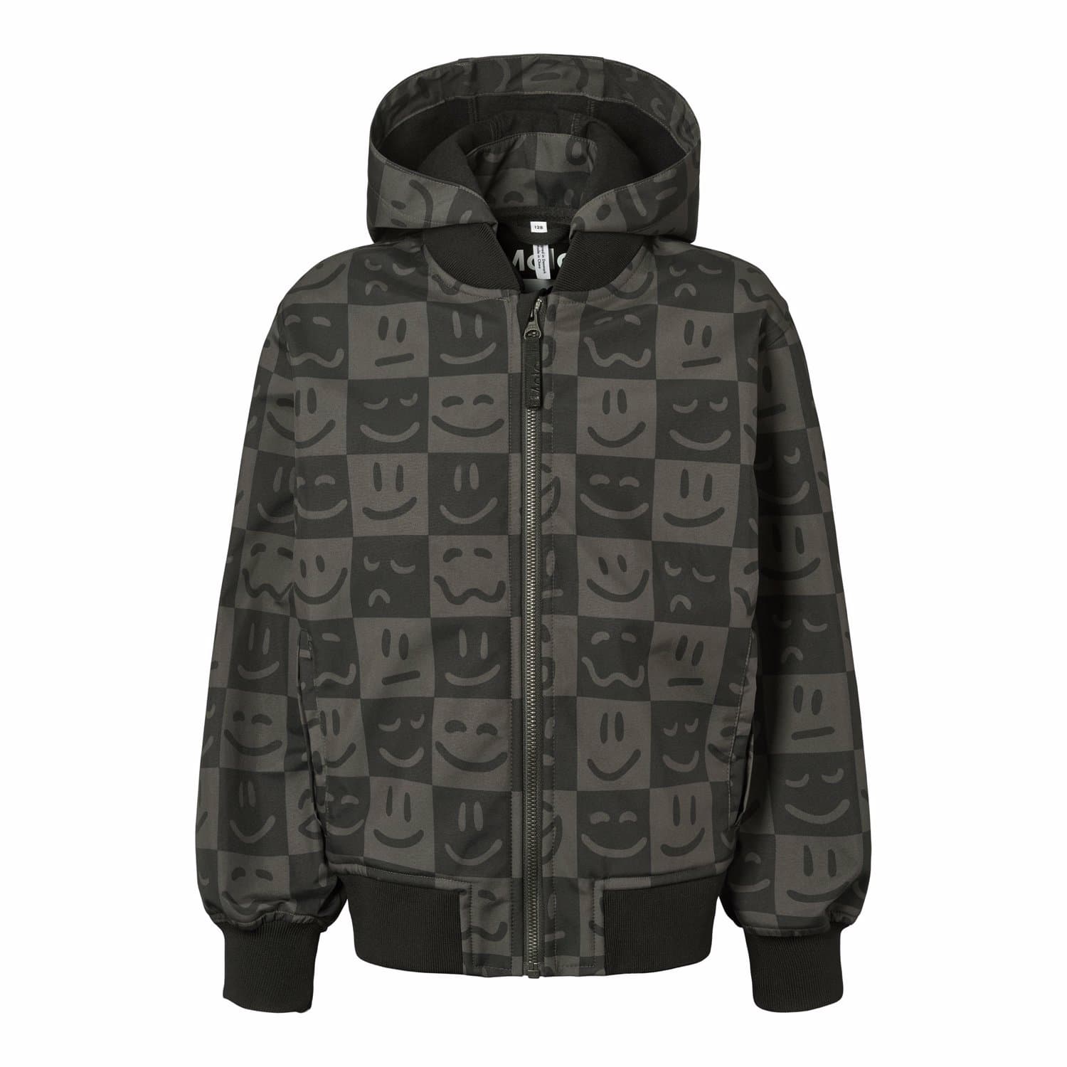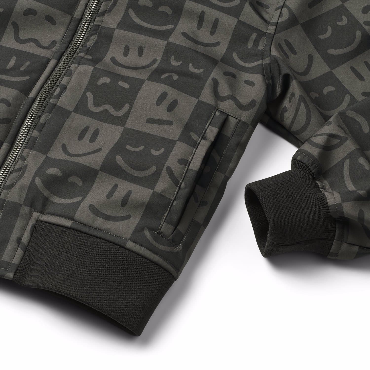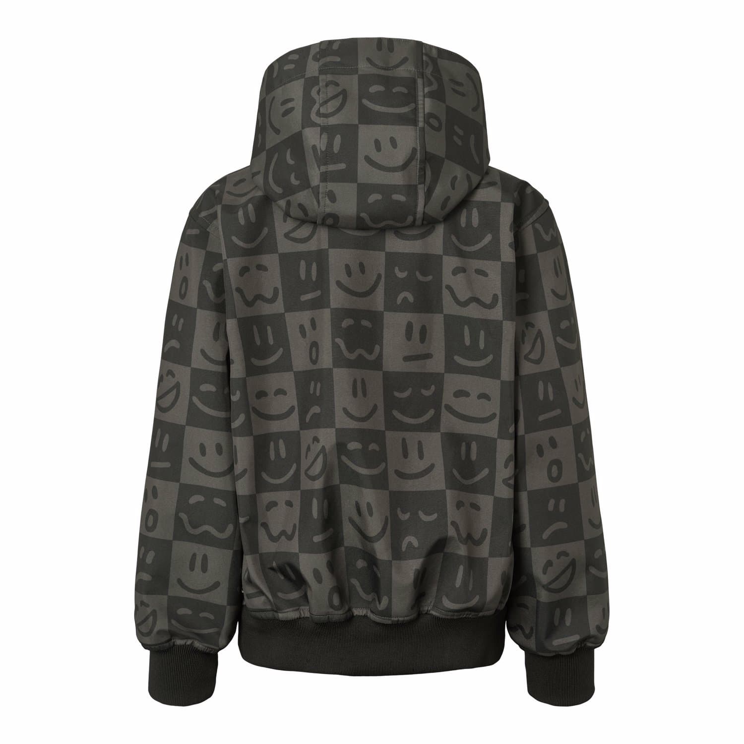 Cloudy is a sporty, waterproof soft shell jacket in check with a print of smile faces. Cloudy has a zip front, side pockets and wind cuffs at the sleeve openings. It has an elastic edge at the bottom.