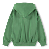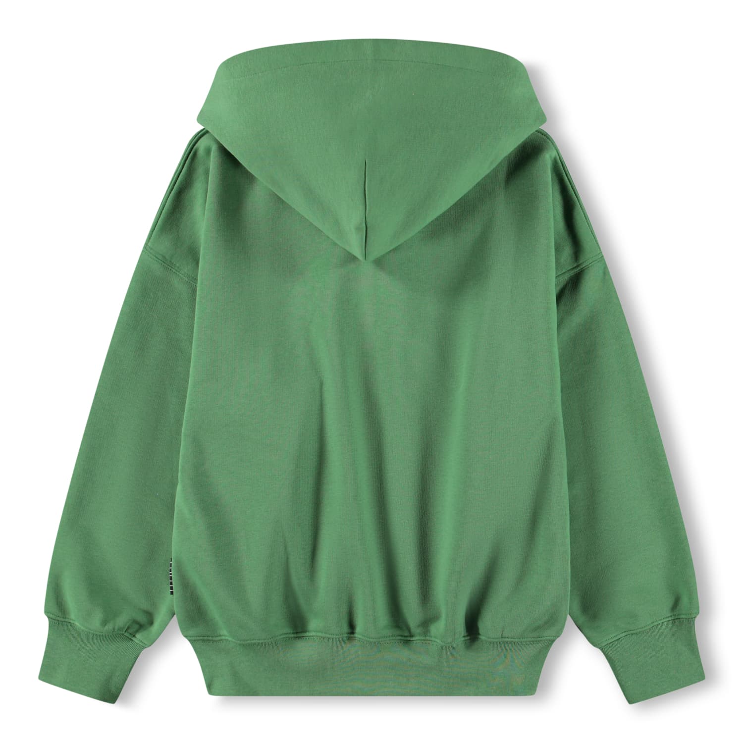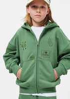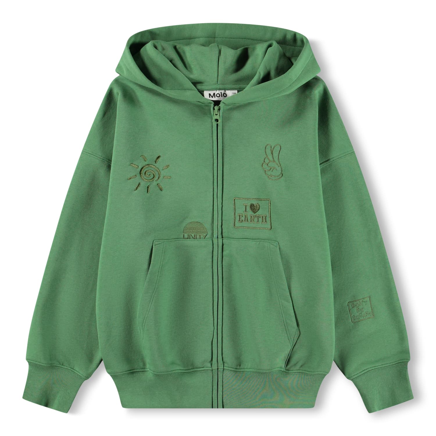 Groovy green cotton hoodie with a kangaroo pocket, a front zipper and ribbed cuffs and hem. This hoodie has black prints of various dope signs on the front.This Molo product is STANDARD 100 by OEKO-TEX®-certified.