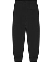 Black organic cotton sweatpants with an elastic waist, internal drawstring, zippered pockets, and a snug ribbed cuff at the ankles. The trousers have a regular fit and a small embroidered face near the pocket. The brushed interior makes them soft and cosy to wear.