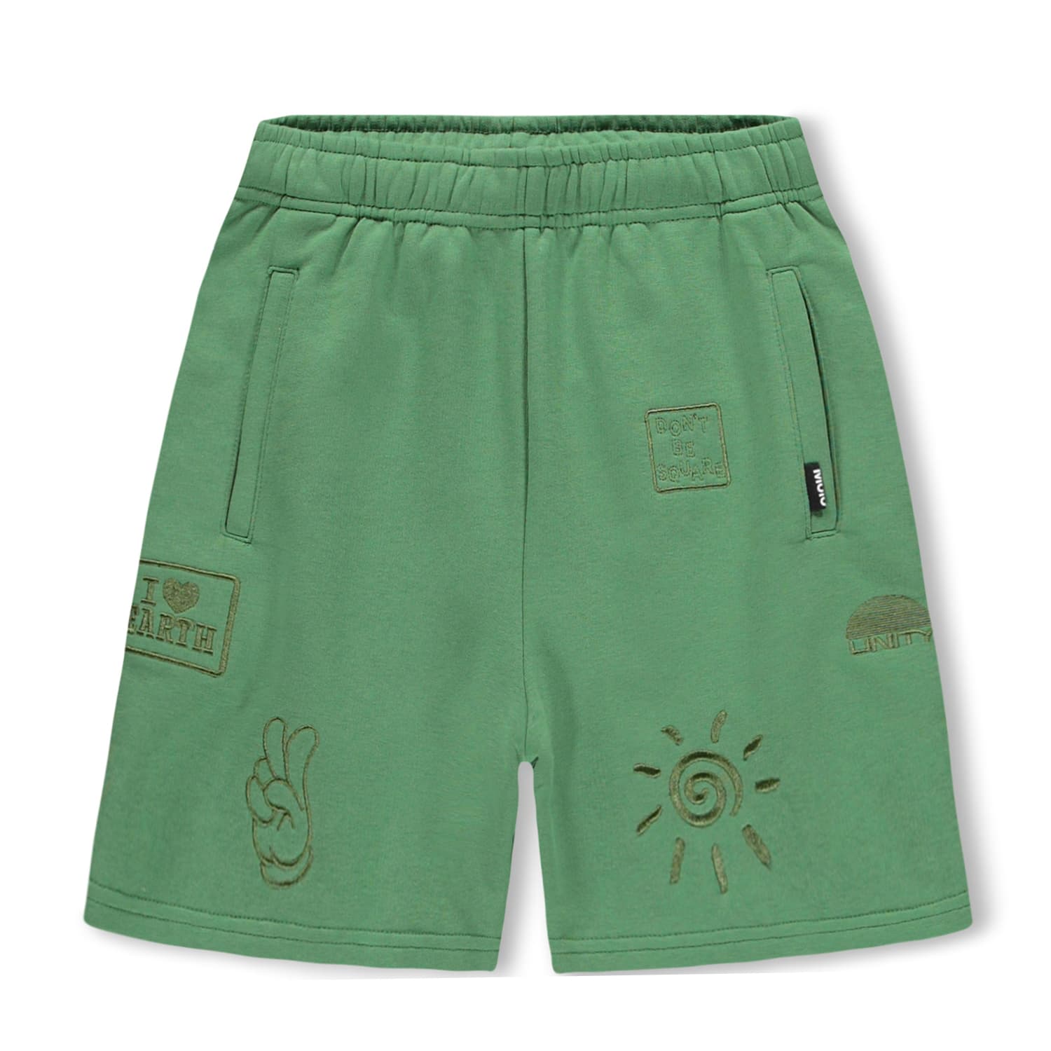 Amil is a pair or sweat shorts in a groovy green print. They are in 100% organic cotton. The shorts end at the knee, have wide legs and an elastic waist with a drawstring. They have side pockets, a single back pocket, and they are in a regular fit. For an extra cool look, you could wear them with Marley, the matching hoodie, in the same print. Molo's groovy green print is unique and made by hand, so the print may vary from style to style.