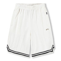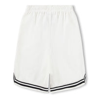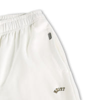 Soft shorts in white with black details, made of organic cotton. The shorts have a loose fit and reach around the knee. They have side pockets, back pocket, and elastic and drawstring at the waist which makes it comfortable and easy to move in.