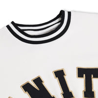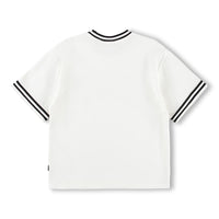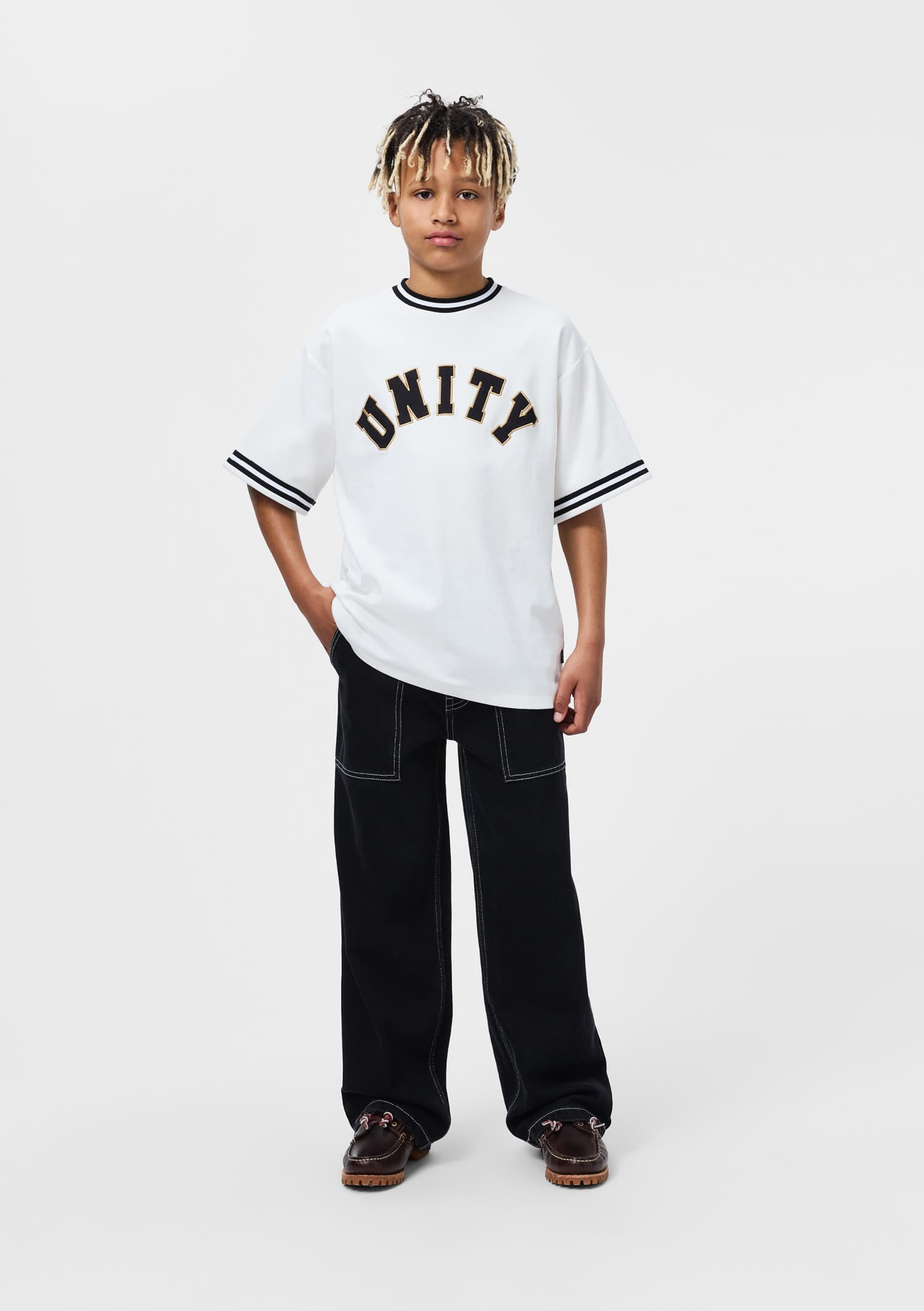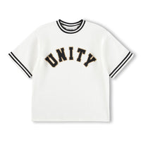 White T-shirt with a round neck and striped trim around the neck and sleeves. The T-shirt has a loose fit with a sporty, classic look and the text Unity on the front.This Molo product is GOTS Organic certified by Ecocert Greenlife, License no. 197496.