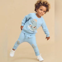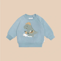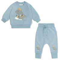 Construction Dino organic cotton fleece Sweatsuit and pants set. It's warm, comfy, stylish, and long-lasting—in case of younger siblings or cousins.