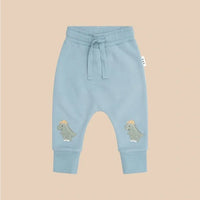 Super soft, premium organic cotton fleece drop crotch pant with dino applique on knees Features non-functional (decorative) drawstring and soft elasticised waistband Made from certified organic cotton Sustainably produced Safe azo free dyes
