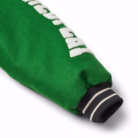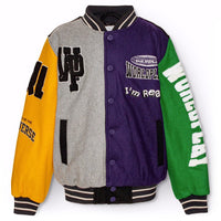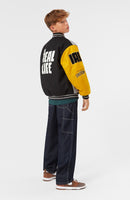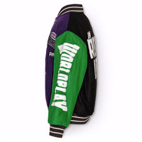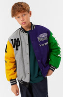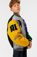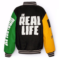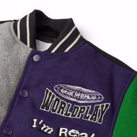 Baseball jacket in green, yellow, grey, and purple colours. The jacket has snaps on the front, black piped pockets, and striped ribbed edges at the neck, cuffs, and waist. The jacket is made from a wool blend, which helps to regulate the temperature. The jacket has several stylish patches that characterize the collection, such as "World Play," "In Real Life," and "I'm Real"