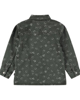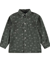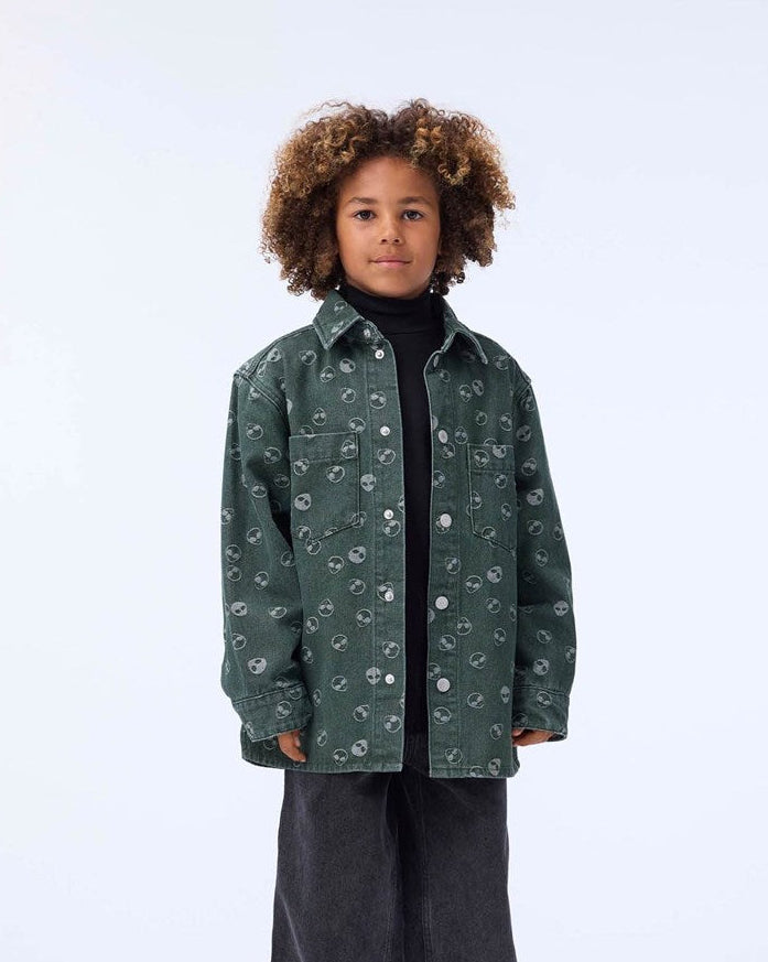 Green shirt made of jacquard denim cotton blend with woven alien patterns in the fabric. The shirt has two pockets at the front and a button closure and can be worn both closed or as an overshirt over a T-shirt for a relaxed look.