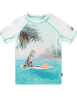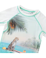The rashguard has print of a beautiful beach and a cheetah on a surfboard. The product is CE-marked and tested according to standard EN-13758-1.