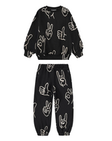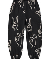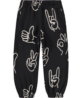 Black sweatpants made of organic cotton with an elastic waist, inner drawstring, elastic around the ankles and side pockets. The sweatpants have a regular fit and a white print of various hand signs.