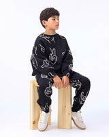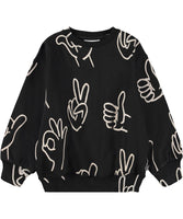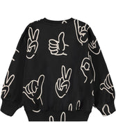 Black sweatshirt made of soft organic cotton with printed hand signs in white. The sweatshirt has ribbed edges around the neck, sleeves and waist. The sweatshirt has a loose fit.