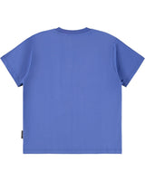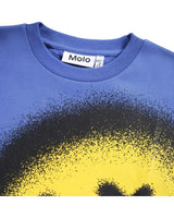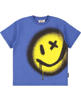 Blue T-shirt made of soft organic cotton with short sleeves and a ribbed neckline. The T-shirt has an oversized fit with a print of a spray-painted smiling and melting face.