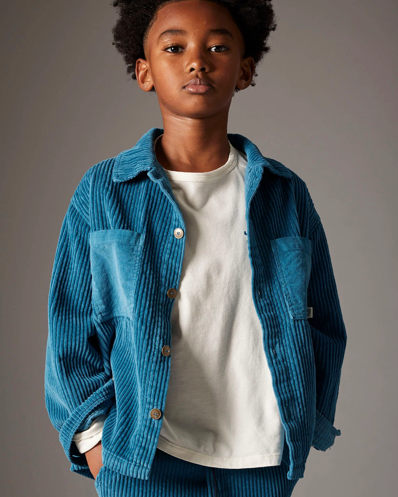 Super soft and cozy wide corduroy shirt made from OCS and OEKO-TEX certified organic cotton. It features a collar with contrasting corduroy fabric on the inside, metallic buttons at the front, two chest patch pockets in contrasting corduroy, cuffs lined with ‘Cozmo’ fabric, and a back yoke. Gentle to the touch and pleasantly snug. Designed for boys.