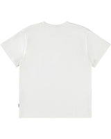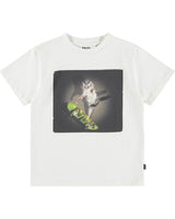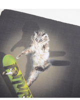 This white t-shirt features a fun graphic of a cat riding a skateboard, capturing the essence of adventure and creativity.