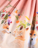 Long-sleeved pink dress made of organic cotton with a fitted ribbed jersey top and poplin skirt. The dress has a regular fit with a print of decorated animals on the skirt.